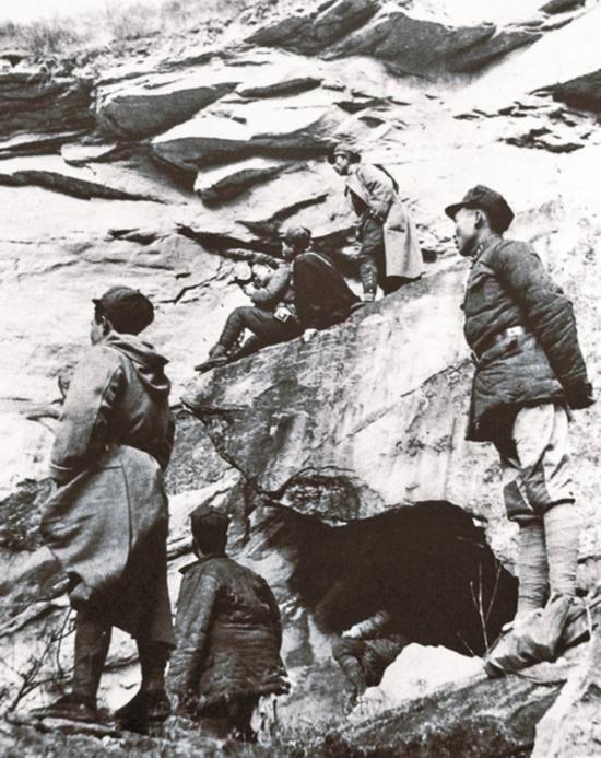 延安電影團(tuán)成員們?cè)谇鍥錾降膸r石上拍攝素材