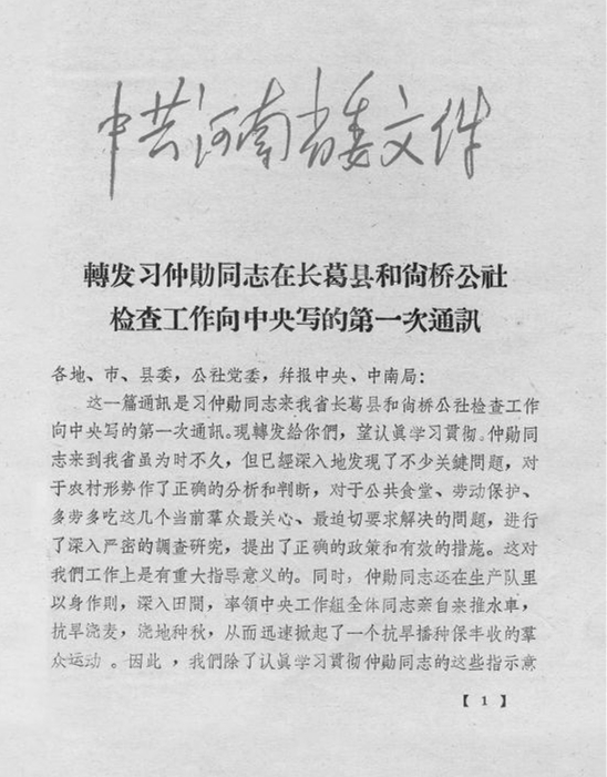 圖為當(dāng)時河南省委轉(zhuǎn)發(fā)的習(xí)仲勛調(diào)研材料