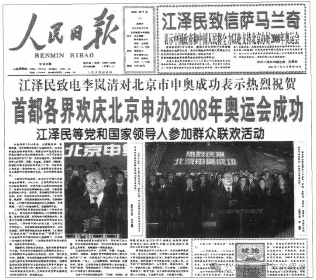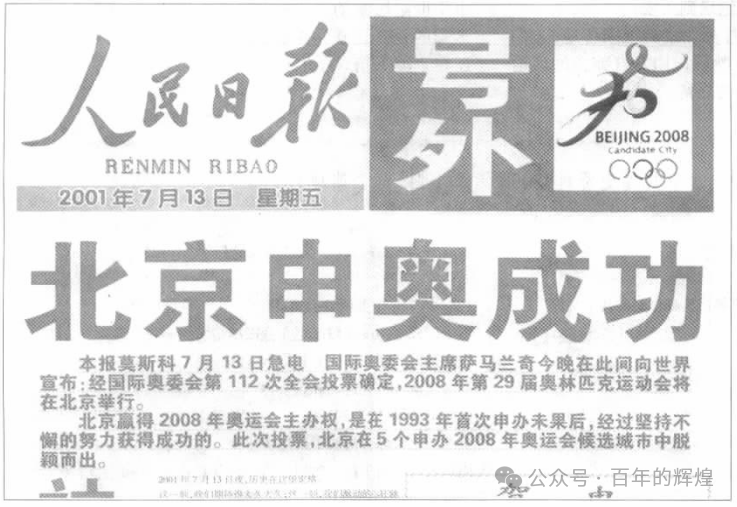 2001年7月13日晚,北京申奧成功后《人民日報》出版的號外