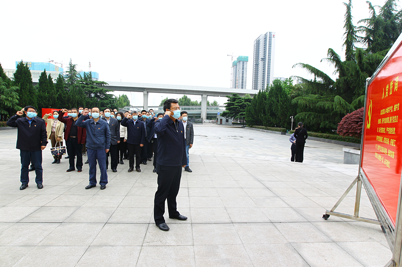 在二七烈士紀(jì)念碑前,施李國(guó)同志帶領(lǐng)全體黨員面向鮮紅黨旗重溫入黨誓詞。
