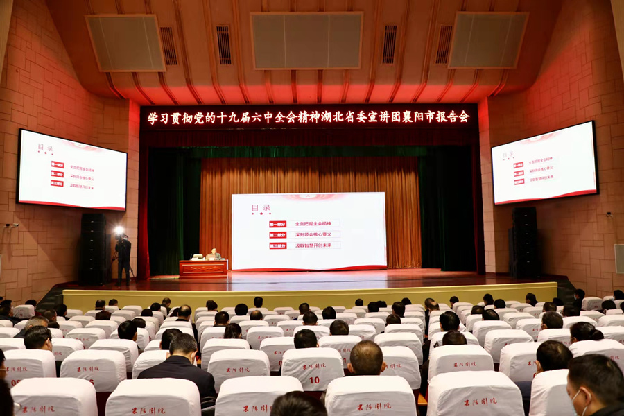 12月15日,根據(jù)省委統(tǒng)一部署,學(xué)習(xí)貫徹黨的十九屆六中全會精神湖北省委宣講團在襄陽市宣講,省委宣講團成員、省委黨史研究室主任何光耀作了題為《汲取歷史智慧 凝聚奮進力量》的宣講報告。省政協(xié)副主席、襄陽市委書記馬旭明出席報告會,襄陽市委副書記、政法委書記胡勇主持報告會。