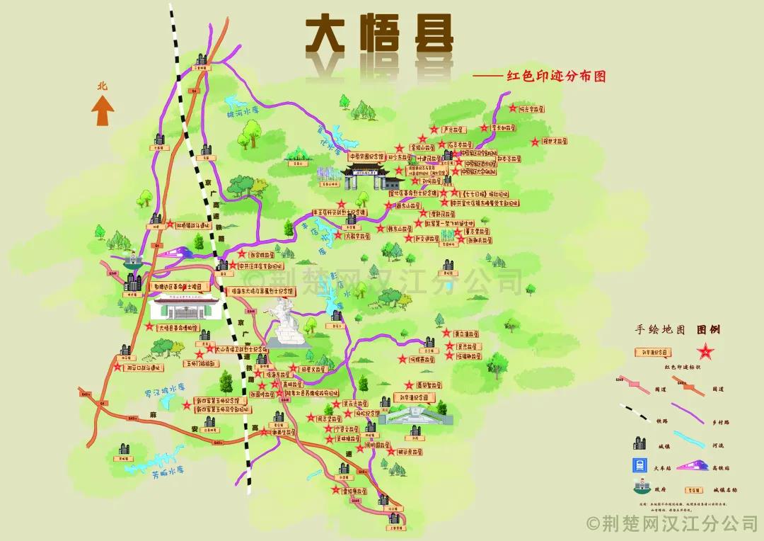 該地圖涵蓋了中原突圍紀(jì)念館、鄂豫邊區(qū)革命烈士陵園、新四軍第五師紀(jì)念館以及徐海東故居等多個(gè)時(shí)間段在大悟所發(fā)生的或遺留的紅色革命歷史遺址遺跡等紀(jì)念設(shè)施。