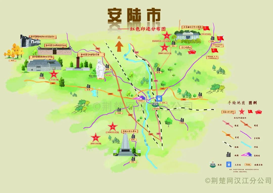 該手繪地圖根據(jù)各時(shí)期的革命歷史背景,將安陸眾多革命歷史遺址、遺跡、紀(jì)念館、故居、陵園等紅色資源融入其中。
