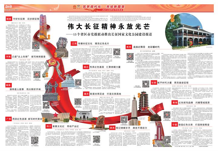 2024年是紅軍長征出發(fā)90周年,為深入貫徹落實習近平總書記相關重要指示批示精神,全國兩會期間,貴州日報聯(lián)合福建日報、江西日報、河南日報、湖北日報、湖南日報、廣西日報、重慶日報、四川日報、陜西日報、甘肅日報、青海日報、寧夏日報,聚焦長征國家文化公園建設情況,生動呈現(xiàn)各地如何以長征國家文化公園建設為載體,展現(xiàn)長征文化、弘揚長征精神、賡續(xù)紅色血脈。