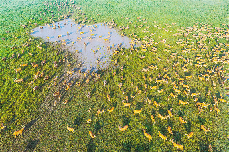 石首麋鹿國(guó)家級(jí)自然保護(hù)區(qū)內(nèi)麋鹿奔馳。