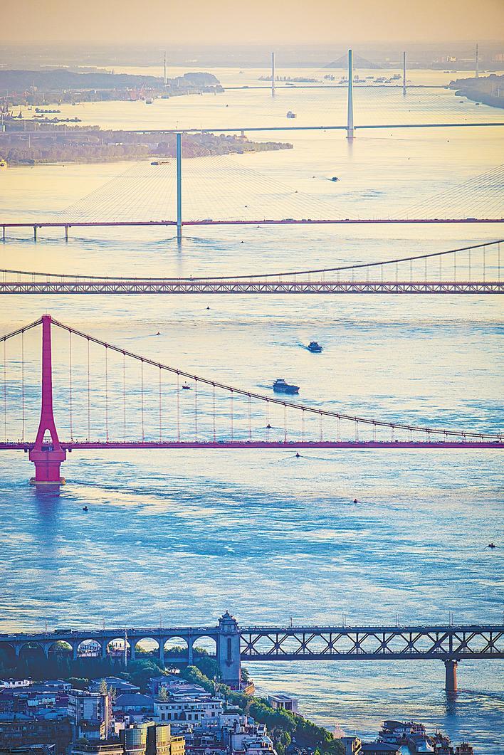 武漢晴空萬(wàn)里,能見度極高,在高處遠(yuǎn)眺,一眼可以看到六座長(zhǎng)江大橋。 (湖北日?qǐng)?bào)全媒記者 任勇 攝)