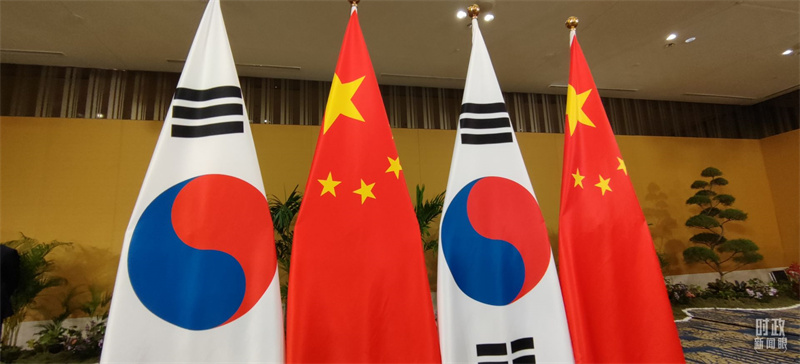 △會(huì)見現(xiàn)場(chǎng)的中國(guó)和韓國(guó)兩國(guó)國(guó)旗。(總臺(tái)央視記者耿小龍拍攝)