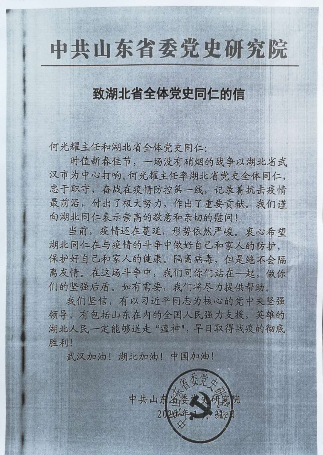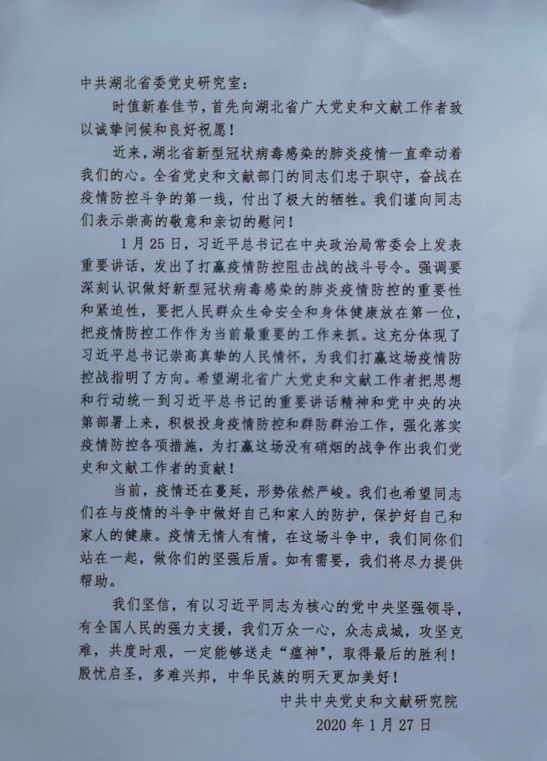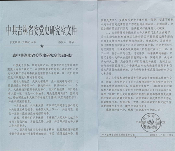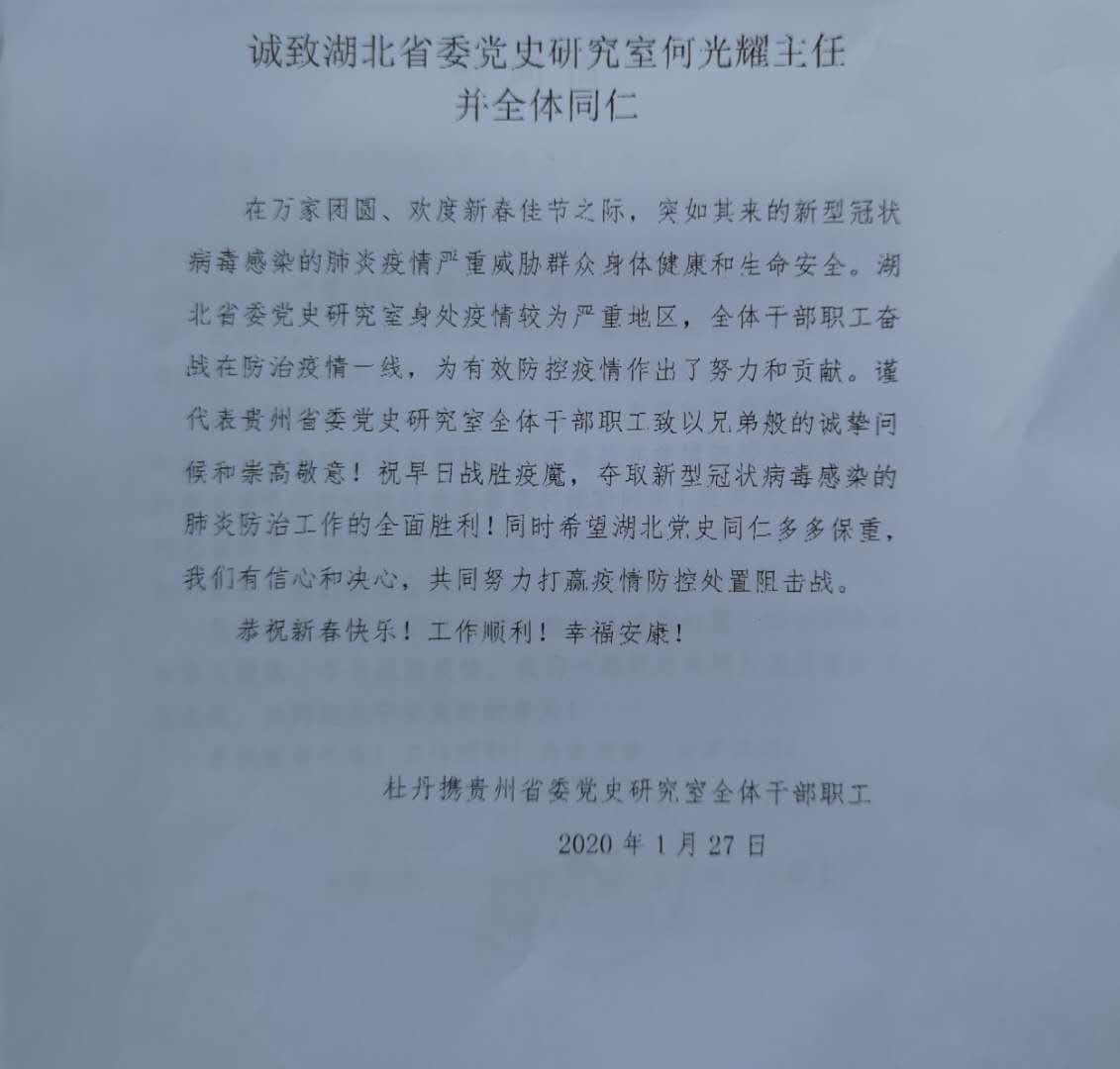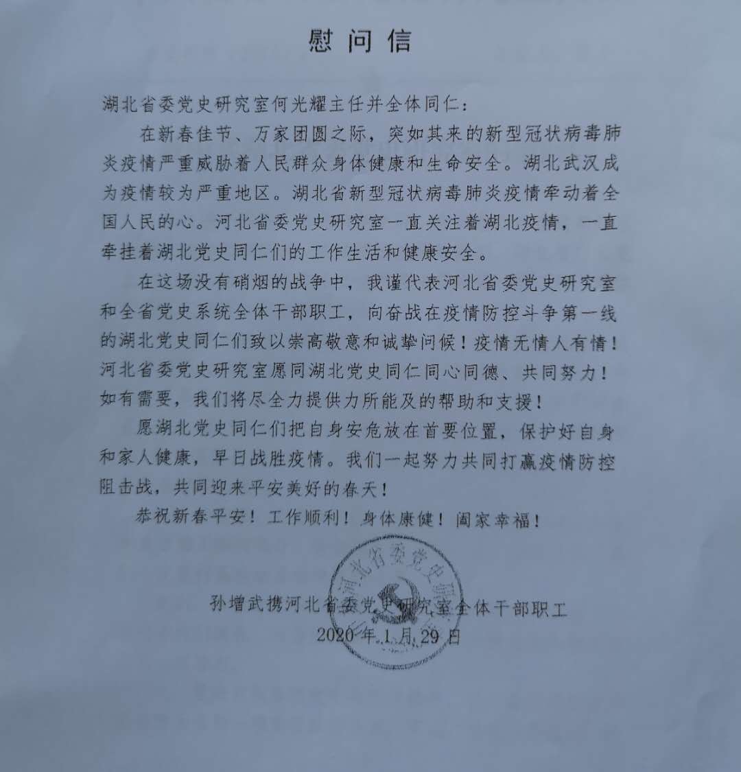 湖北省新冠肺炎疫情一直牽動著中央黨史和文獻(xiàn)研究院及兄弟省市區(qū)黨史文獻(xiàn)部門各級領(lǐng)導(dǎo)和廣大同仁的心。中央黨史和文獻(xiàn)研究院曲青山院長對此高度關(guān)注,召集專門會議,專題研究疫情防控和支援救助工作,并以單位名義于1月27日給我室發(fā)來慰問信,向奮戰(zhàn)在疫情防控斗爭第一線的湖北省廣大黨史和文獻(xiàn)工作者表示誠摯問候,鼓勵大家再接再厲,積極投身疫情防控和群防群治,表示將盡全力提供力所能及的幫助和支持,為打贏疫情防控阻擊戰(zhàn)作出黨史人的貢獻(xiàn)。貴州、河北、山東、吉林、湖南、內(nèi)蒙古、江西、新疆、河南、浙江等地省委黨史文獻(xiàn)研究室,也紛紛來電來函聲援湖北抗擊疫情,讓我們感受到“一方有難、八方支援,同舟共濟(jì)、共克時艱”的親情關(guān)懷,增添了力量,激發(fā)了斗志。