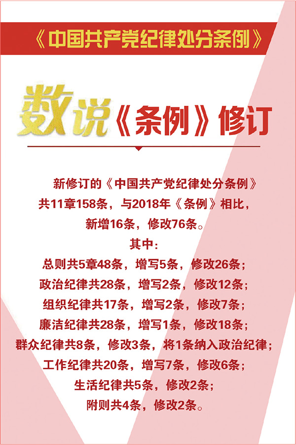 2023年新修訂的《中國(guó)共產(chǎn)黨紀(jì)律處分條例》,與時(shí)俱進(jìn)完善紀(jì)律規(guī)范,與2018年《條例》相比,新增16條,修改76條,進(jìn)一步扎緊織密制度籠子。