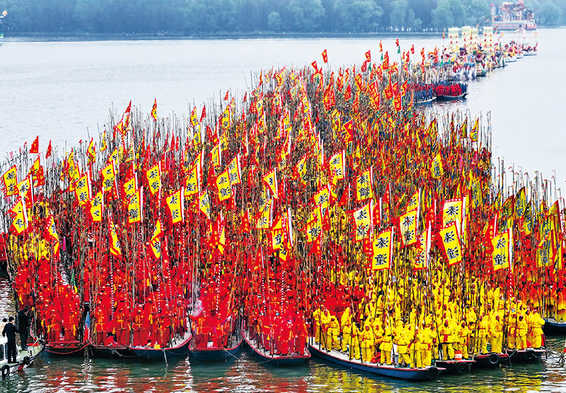 2024年4月6日,泰州姜堰溱潼會船在江蘇省泰州市姜堰區(qū)溱湖國家濕地公園開幕,數(shù)百條各式各樣的船只和上萬名會船選手云集溱湖,飛篙走槳,奮勇爭先,呈現(xiàn)“千篙萬槳鬧溱湖,百舸爭流逐春潮”的壯觀場景,演繹歷久彌新的民俗畫卷。溱潼會船由南宋相沿至今,歷經(jīng)數(shù)百年傳承,被列入國家級非物質(zhì)文化遺產(chǎn)名錄。圖為當(dāng)日參加溱潼會船表演的船只在湖面上整裝待發(fā)。 新華社發(fā) 顧繼紅/攝