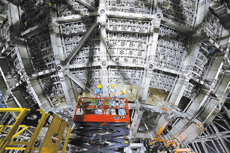 目前,全國職工總數(shù)約4.02億人,其中產(chǎn)業(yè)工人占職工隊伍總數(shù)的半數(shù)左右,這樣一支龐大的隊伍,蘊含著無窮的智慧和力量,是實現(xiàn)新時代新征程黨的目標(biāo)任務(wù)的力量所在、底氣所在。圖為2024年10月10日,工人在中國科學(xué)院高能物理所江門中微子實驗建設(shè)場地安裝中心探測器上的光電倍增管。 新華社記者 金立旺/攝