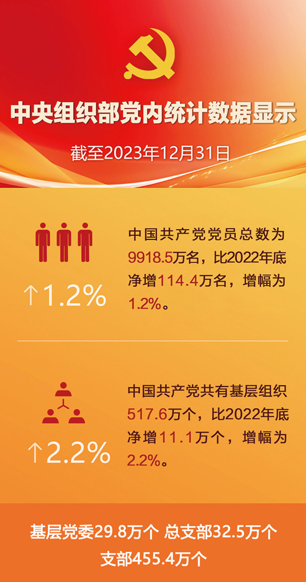 中央組織部2024年6月黨內(nèi)統(tǒng)計數(shù)據(jù)顯示:截至2023年底,中國共產(chǎn)黨黨員總數(shù)為9918.5萬名,比上年凈增114.4萬名。黨的基層組織517.6萬個,比上年凈增11.1萬個。中國共產(chǎn)黨堅持大抓基層的鮮明導向,持續(xù)強基固本、補齊短板弱項,不斷嚴密上下貫通、執(zhí)行有力的組織體系,全面加強黨員隊伍建設(shè),充分發(fā)揮基層黨組織戰(zhàn)斗堡壘作用和黨員先鋒模范作用,使黨始終保持旺盛生命力和強大戰(zhàn)斗力。