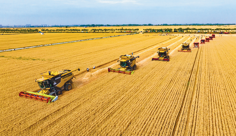 2024年,我國糧食生產(chǎn)邁上新臺階,首次突破1.4萬億斤,農(nóng)業(yè)綜合生產(chǎn)能力不斷提升,國家糧食安全根基日益夯實。圖為2024年5月29日,在河南省駐馬店市西平縣老王坡高標(biāo)準(zhǔn)農(nóng)田,機收編隊在收獲小麥。 新華社發(fā) 趙永濤/攝
