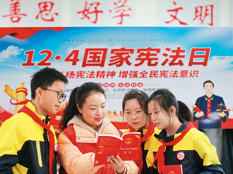 江蘇省揚州市杉灣花園社區(qū)普法志愿者給學(xué)生講解憲法知識(2023年12月4日攝) 新華社發(fā)(孟德龍攝)
