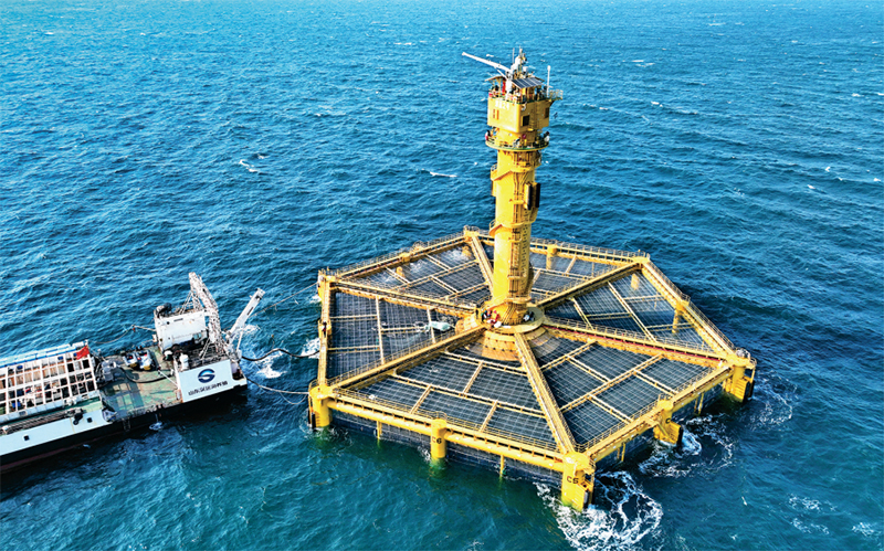 近年來,我國在一些共性技術(shù)研發(fā)創(chuàng)新上不斷取得突破。圖右側(cè)為我國自主研制的大型全潛式深海智能漁業(yè)養(yǎng)殖裝備——“深藍2號”(2025年1月12日攝,無人機照片)。 新華社記者 李紫恒/攝