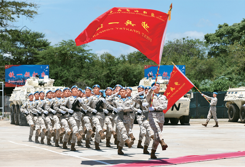 中國堅(jiān)定支持聯(lián)合國為應(yīng)對和平安全挑戰(zhàn)發(fā)揮更大作用,忠實(shí)履行安理會(huì)常任理事國職責(zé)和使命。圖為2023年9月28日,聯(lián)合國駐南蘇丹特派團(tuán)(聯(lián)南蘇團(tuán))在其超級營地舉行授勛儀式,向中國第九批赴南蘇丹(朱巴)維和步兵營700名維和官兵授予聯(lián)合國“和平榮譽(yù)勛章”,以表彰他們在執(zhí)行維和任務(wù)期間的卓越表現(xiàn)和為南蘇丹和平事業(yè)作出的突出貢獻(xiàn)。 新華社發(fā) 趙建毅/攝