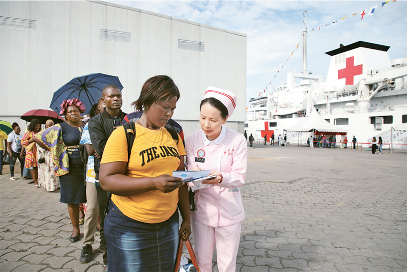 近年來,中國秉持構(gòu)建人類命運(yùn)共同體理念,全面踐行全球安全倡議,為維護(hù)世界和平盡責(zé),以團(tuán)結(jié)合作謀求共同安全,與各國為建設(shè)持久和平、普遍安全的美好世界共同努力。圖為2024年10月10日,中國海軍“和平方舟”號醫(yī)院船在喀麥隆開展活動(dòng),醫(yī)務(wù)人員為候診患者科普護(hù)眼知識。 新華社發(fā) 劉志磊/攝