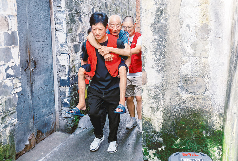 新時(shí)代以來(lái),廣大黨員干部注重走好新時(shí)代群眾路線,不斷把我們黨密切聯(lián)系群眾的優(yōu)良作風(fēng)發(fā)揚(yáng)光大。圖為2024年9月19日,臺(tái)風(fēng)“普拉�!北平覈�(guó)華東沿海,浙江省諸暨市趙家鎮(zhèn)泉畈村村干部和黨員志愿者在臺(tái)風(fēng)來(lái)臨前轉(zhuǎn)移老舊房里的老人。 新華社記者 徐昱/攝