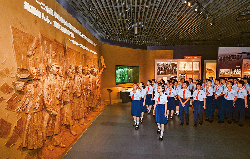 弘揚愛國主義精神,必須把愛國主義教育作為永恒主題。2025年7月7日上午,紀(jì)念全民族抗戰(zhàn)爆發(fā)88周年儀式暨《為了民族解放與世界和平》主題展覽開幕式在中國人民抗日戰(zhàn)爭紀(jì)念館舉行。圖為當(dāng)日少先隊員參觀主題展覽。 新華社記者 陳曄華/攝