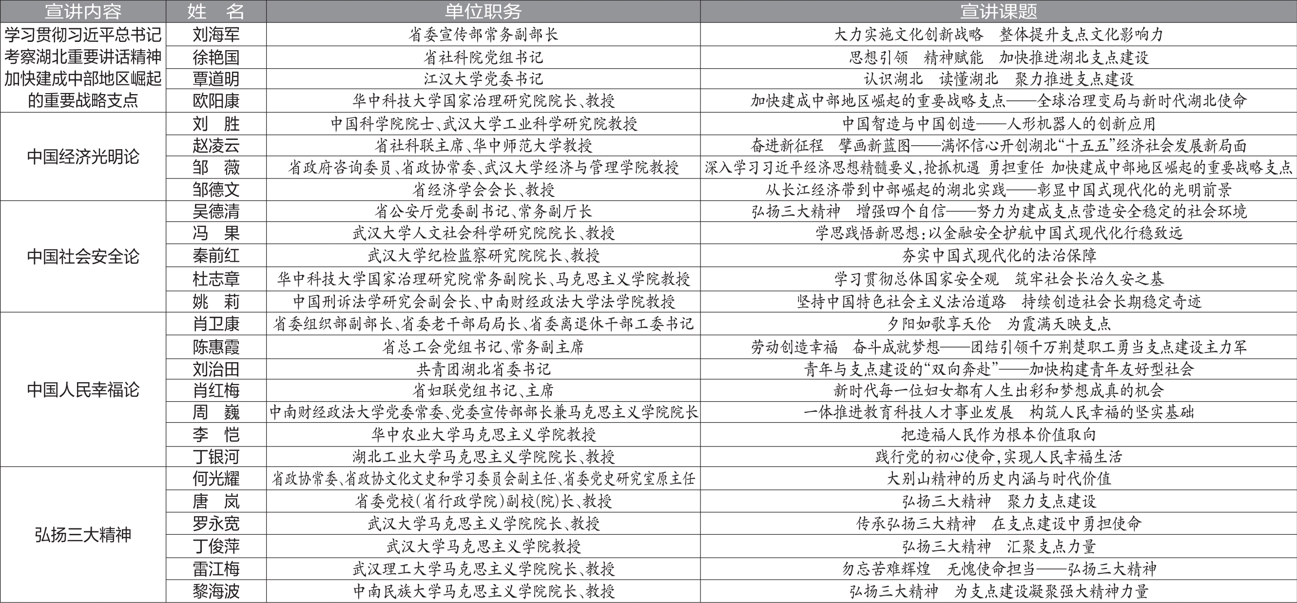 為堅(jiān)持不懈用習(xí)近平新時(shí)代中國(guó)特色社會(huì)主義思想凝心鑄魂,凝聚全省上下團(tuán)結(jié)奮進(jìn)、自信自強(qiáng)的精神力量,省委宣傳部、省委講師團(tuán)組織有關(guān)領(lǐng)導(dǎo)干部和專家學(xué)者,圍繞學(xué)習(xí)貫徹習(xí)近平總書(shū)記考察湖北重要講話精神、加快建成中部地區(qū)崛起的重要戰(zhàn)略支點(diǎn)、中國(guó)經(jīng)濟(jì)光明論、中國(guó)社會(huì)安全論、中國(guó)人民幸福論及弘揚(yáng)三大精神等內(nèi)容進(jìn)行備課,形成一批點(diǎn)單宣講課程。面向各市州和省直機(jī)關(guān)、國(guó)有企業(yè)、高等院校等單位提供點(diǎn)單宣講服務(wù),有需求的單位請(qǐng)發(fā)邀請(qǐng)函至省委講師團(tuán)郵箱[email protected],聯(lián)系電話:027-87234088。