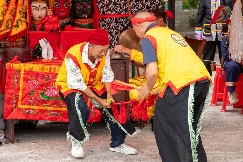 湖北省恩施州鶴峰縣燕子鎮(zhèn)董家村的儺戲演出。(龍炳潔 攝)