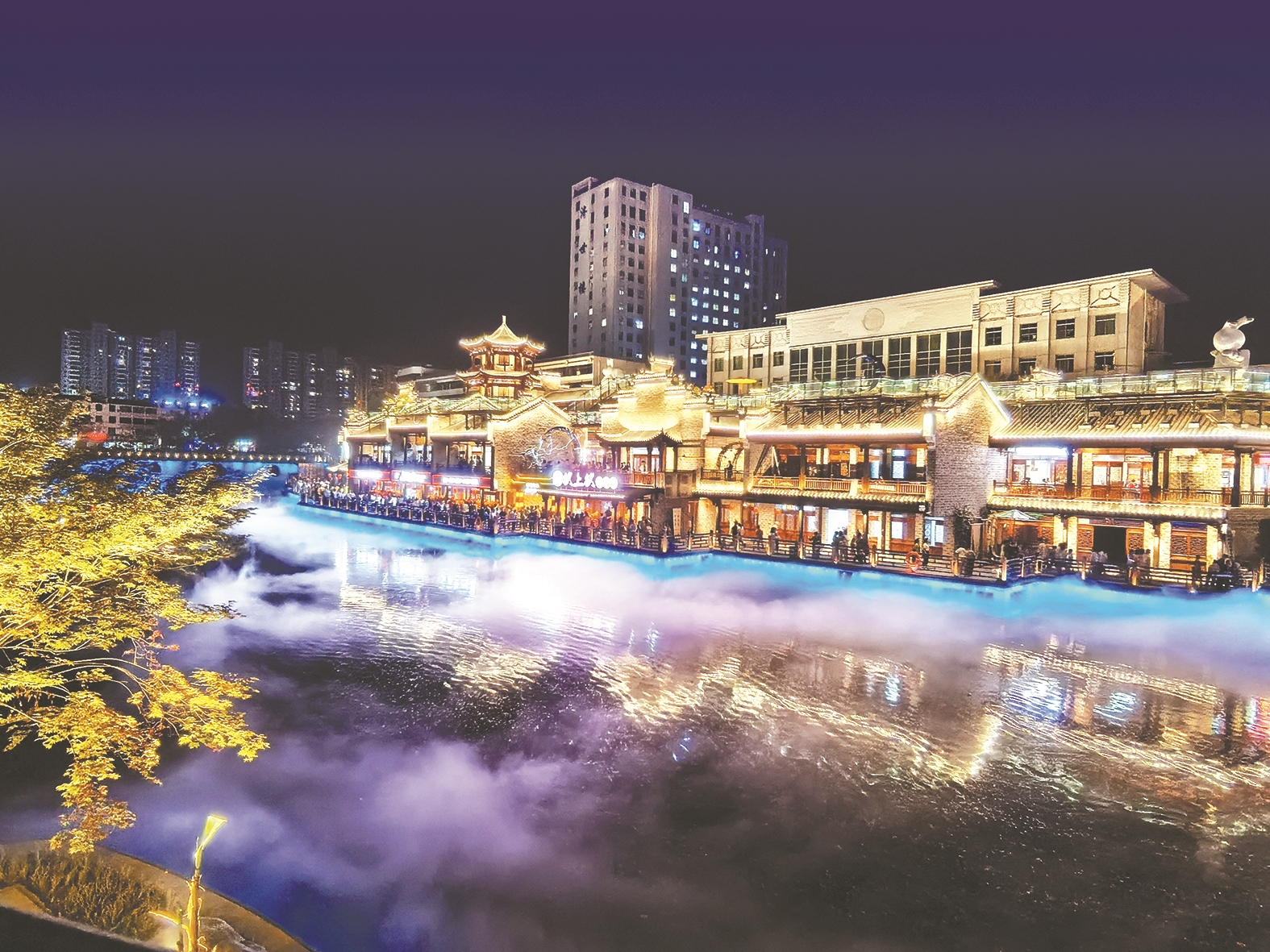 暮色中的武陵不夜城流光溢彩。這條全國首個(gè)戲曲主題沉浸式文旅街區(qū),依托竹溪河天然水體,結(jié)合現(xiàn)代聲光電技術(shù),運(yùn)用花式噴泉、霧森系統(tǒng)、激光投影和全息巨幕,打造大型水景互動(dòng)戲曲演出。水幕成像技術(shù)與CG影像結(jié)合,將山二黃戲曲情節(jié)投射于水面,形成“人在畫中游”的沉浸場(chǎng)景�!伴_街一年半接待游客2000萬人次,帶動(dòng)3500多人就業(yè)�!� 武陵不夜城街區(qū)相關(guān)運(yùn)營公司負(fù)責(zé)人表示。