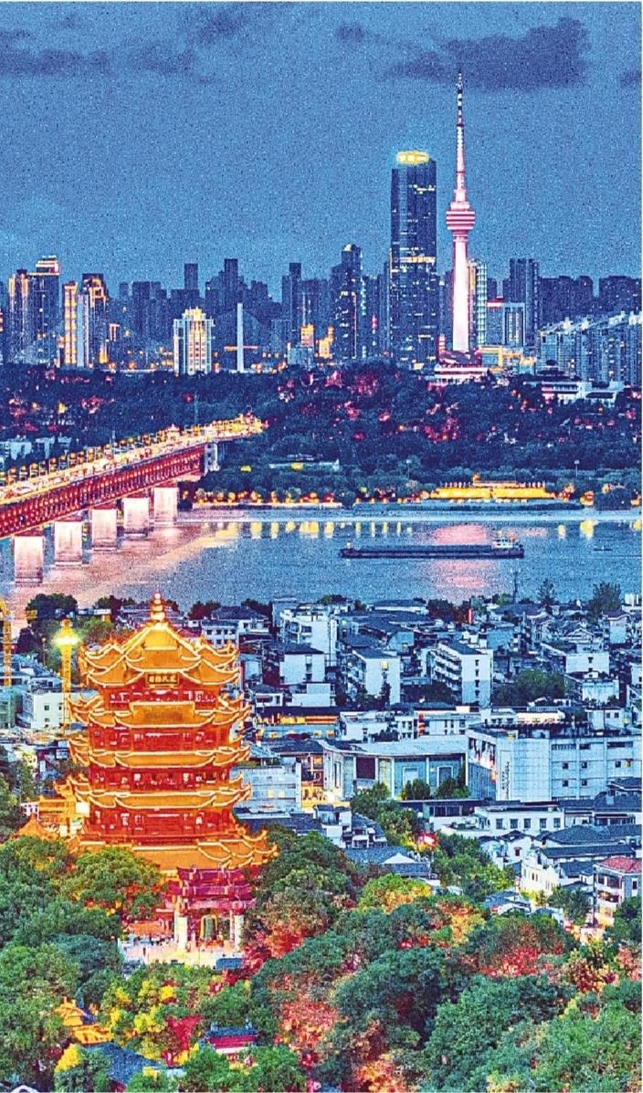 7月21日傍晚,武漢市黃鶴樓景區(qū)流光溢彩,同長(zhǎng)江對(duì)岸現(xiàn)代化建筑群交相輝映,見(jiàn)證盛世繁華。(湖北日?qǐng)?bào)全媒記者 劉曙松 攝)