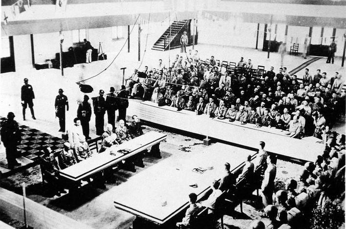 1945年10月25日,中國(guó)戰(zhàn)區(qū)臺(tái)灣地區(qū)接受日軍投降儀式在臺(tái)北公會(huì)堂(現(xiàn)為“中山堂”)舉行。日方代表安藤利吉在投降書上簽字。